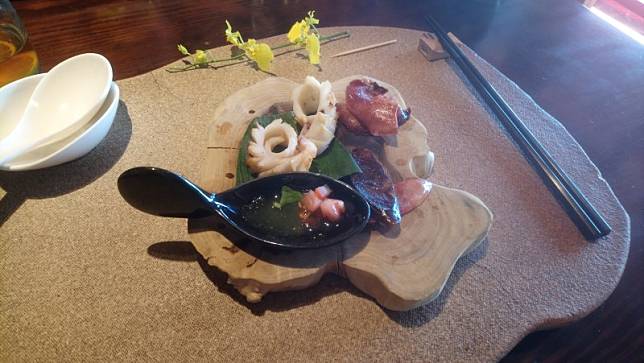 開業相當長的時間,可以算是老牌的無菜單料理,也是新社為數不多會讓人想專程來吃的優質店家。進店之前要先脫鞋,日式的木造建築與庭園水池給人閒適的印象,往窗外望去,不但能將庭園風光盡收眼底,山色與群巒層峰的景致也讓人目不暇給。從裝潢、桌椅甚至是洗手台通通都是木頭材質,陣陣的天然香氣與飯菜香混合,成為又見一炊煙的主旋律。