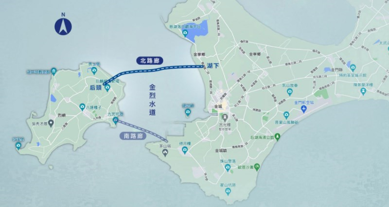 對於觀光而言,「金門大橋」結合慈鳥生態區、金門國家公園古寧頭戰地史蹟等觀光景點的北路廊橋梁路線,則可將金門本島的觀光效益延續至小金門,使大、小金門串連成為一個生活圈,且除了自行驅車過橋之外,民眾還可選擇搭乘電動公車通行;入夜時,橋上更會亮起七彩燈光與海面相互映襯,讓這座國內首座大規模跨海大橋更顯動人。