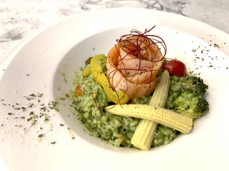 除此之外,還有招牌必點的炙燒煙燻鮭魚燉飯佐羅勒青醬,上頭裝扮成玫瑰的智利煙燻鮭魚,一放入口就能品嚐到煙燻香氣,讓你擁有一整天的好心情。