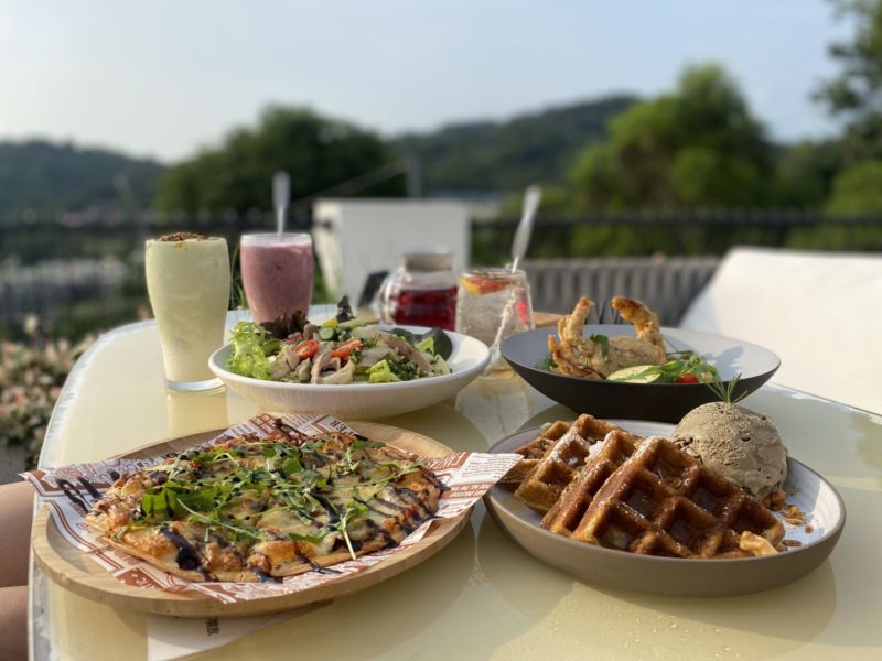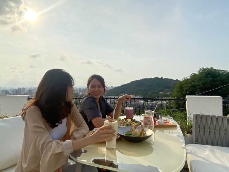 下午好時光適合坐在戶外區,不過還是要提醒想要到露天座位的朋友們,因為位在山區所以小黑蚊較多,擔心被蚊蟲叮咬的話記得帶上防蚊液,才不會影響到整趟旅程的體驗。另外,露天平台的外圍有條廊道,就算座位在室內區也不用擔心拍不到美照~