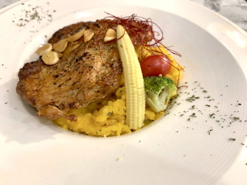 雞腿排出爐後,再以噴燈炙燒雞皮,除表皮微焦脆之外,更讓雞油香氣隨著餐點飄香而來。燉飯米心硬度符合大眾,若你是原產地饕客,也可以在點菜時要求米心硬度。味道香濃的南瓜甜度恰到好處,且南瓜黃也讓人心情十分愉悅。