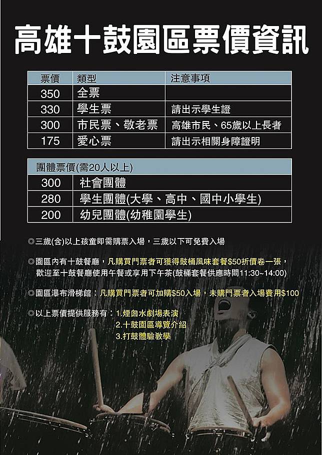 十鼓園區為高雄橋頭糖廠的一部份,只是想在十鼓橋頭文化園區漫步,無須要參加新子兒童館、水劇場與導覽活動,不用購票可自由進出園區唷!另提供票價如下 :