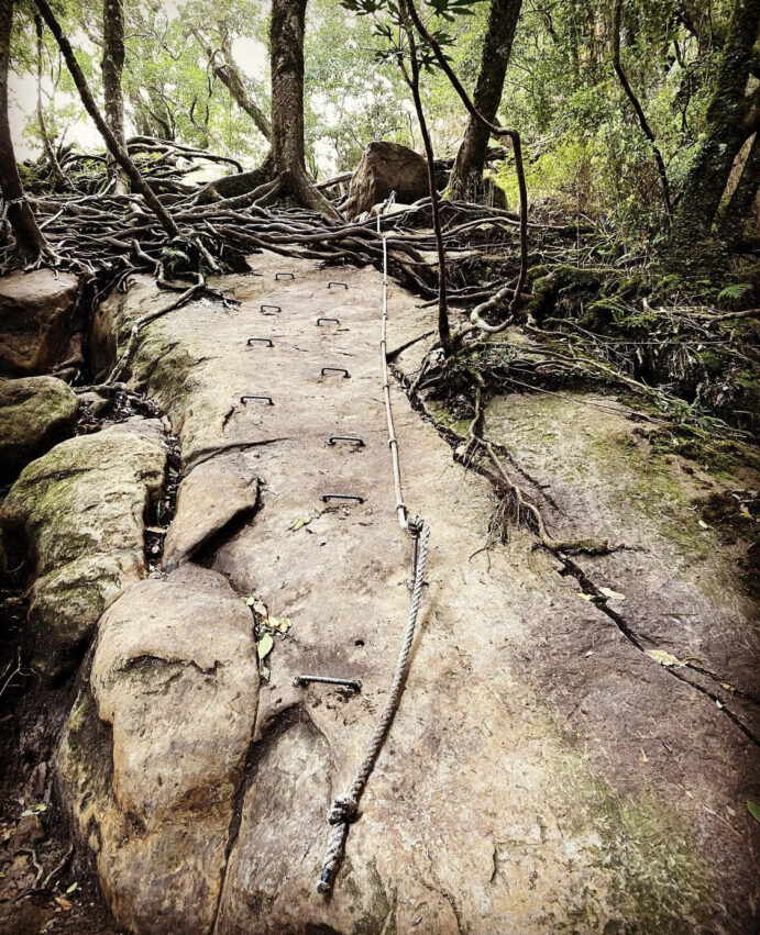 沿途優美的柳杉林景觀與巨石群不僅養眼,更能讓人忘卻身體的辛苦!岩壁拉繩路段非常有挑戰性,既刺激又有趣,樹木與巨石盤根錯節中帶有森林的神祕感,非常有可看性!九號救援椿陡升坡開始,林相開始變化,森氏杜鵑、金毛杜鵑群落層出不窮,還有翹距根節蘭、馬鞭蘭,運氣好還能看到台灣特有種「一葉蘭」,加里山的春季,是花卉點亮整座山林的最美時刻!
