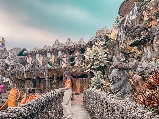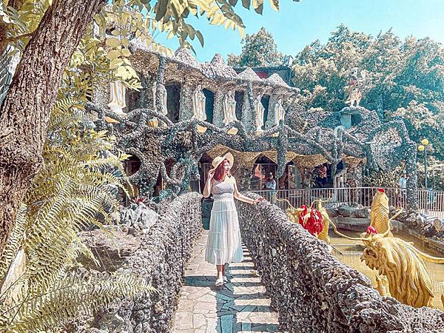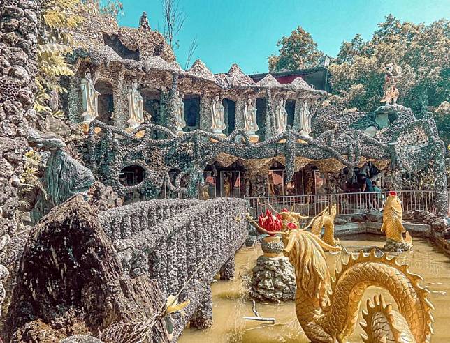 石頭廟裡採光明亮,而裏頭的水上石橋也是最多民眾的美拍打卡熱點,背後是以巨大石頭設計而成的壯麗假山,而前面的池塘上還有著兩條金色巨龍在上演搶珠的畫面,有如一個曠世遺跡般的壯觀,此外橋內的石柱更是驚人,全部都是以石頭和貝殼排列而成,讓人有走入異國的錯覺。