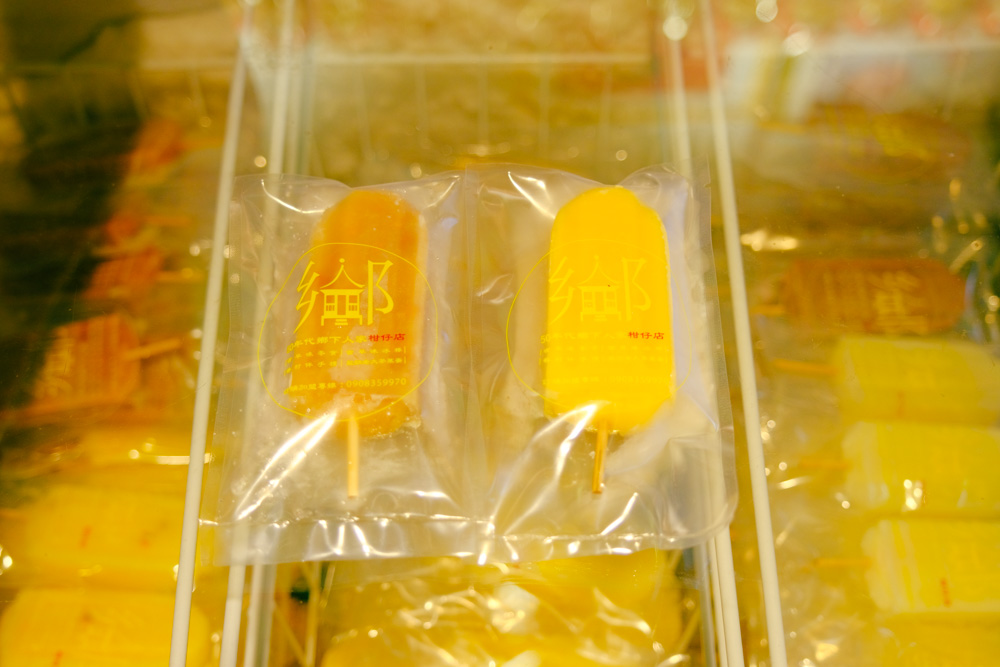 現場除了用的也有吃的,店員穿上學生制服戴上橘色帽子,販售起小時候必吃的蜜餞、冰棒、和茶葉蛋。冰棒有多種口味可挑選,其中芒果和桂圓糯米是店內招牌,冰棒是由運轉四十年的製冰廠製作而成,芒果冰棒用整顆芒果下去製作,整枝紮實味道濃郁,吃得到芒果果肉;桂圓糯米冰棒則是以大顆桂圓製成,打開包裝便散發糯米香氣,吃下一口後糯米便和桂圓的甜味合而為一。