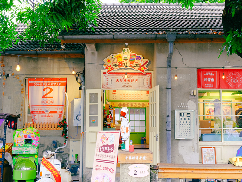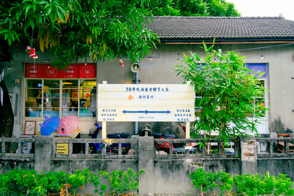 近年來吹起復古風,五六十年代的記憶被搬上檯面,剛好勝利星村日式軍舍的復古外觀成了觀光打卡的好去處。老闆一年前決定動手將老屋子改造成柑仔店,開始賣起小時候的玩具,像是陀螺、泡泡水、毽子、抽抽樂、玩具模型等等,也將家中收藏搬入店舖,掛上大型標語和圖畫,加上舊式的傢俱家電,看起來就像是穿越了時空回到四五十年前!