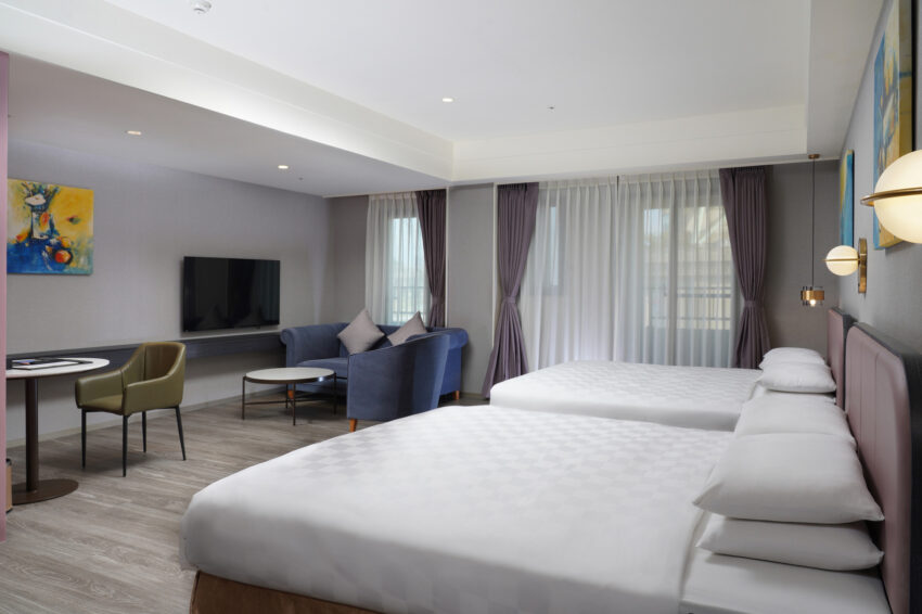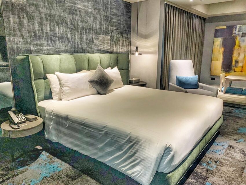 距離瑞豐夜市僅短短100公尺,可以吃完一輪回飯店休息完繼續吃。房型很多,其中最夯的就是景觀房啦!被落地窗包圍的半圓形房間,躺在床上就可以從房間俯瞰左營市區夜景,飯店頂樓還打造了一個空中花園,能在綠意盎然的高處自在地享受著城市街景。