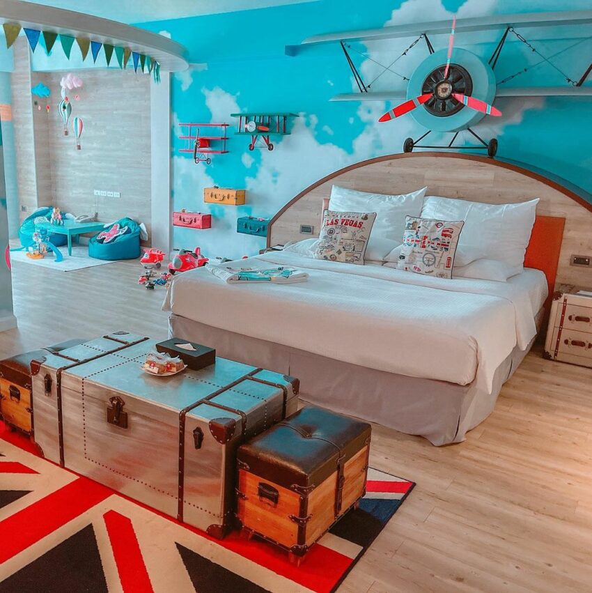 離樂園較近的義大皇家酒店,前往樂園超方便!飯店設施豐富,有滑水道、泳池、射箭場、高爾夫球等等,房間寬敞明亮,窗外就能看到義大摩天輪,還有特別為小朋友設計的兒童主題房,光在飯店就能玩得盡興。