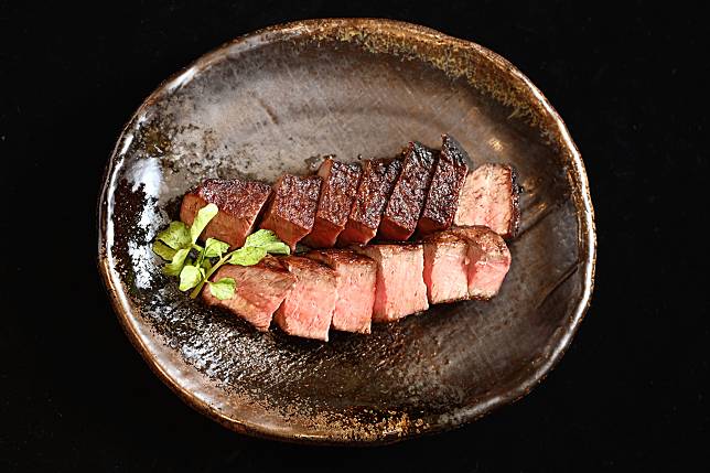 日本A5和牛紐約克厚切,入備長炭窯烤爐燒烤,經過適度靜置再回烤,肉質呈現誘人的五分熟粉紅色並保留肉汁,煙燻油脂香氣誘人。(圖片提供/樂軒和牛割烹)