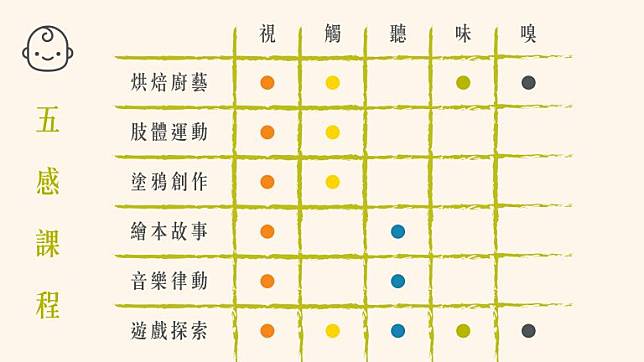 視覺、聽覺、味覺、嗅覺、觸覺,俗稱「五感」;0 ~ 3 歲的幼兒,運用五感探索環境,開啟認識世界的第一步;擁有具體感官認知的 3 ~ 6 歲孩子,則可透過「五感」遊戲刺激、開發課程,一來可豐富孩子的大腦學習,二來可進階培養孩子的創意、專注、情緒穩定、問題解決等能力。