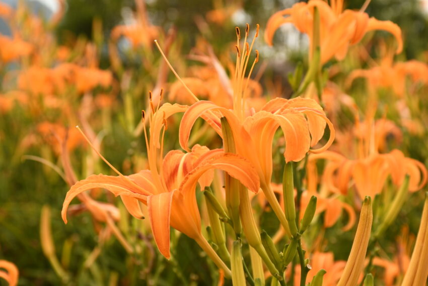 嘉義梅山橫山屏休閒園區種滿各式各樣的花,櫻花、油桐花、桃花心木等,而這裡最廣為人知的就是金針花了!每到五、六月,金針花盛開時,沿著道路綿延的金針花,如火苗般烈焰,與後方高聳的桃花心木相映相襯著,和廣闊的白雲綠地景色相比起來,別有一番特色喔!