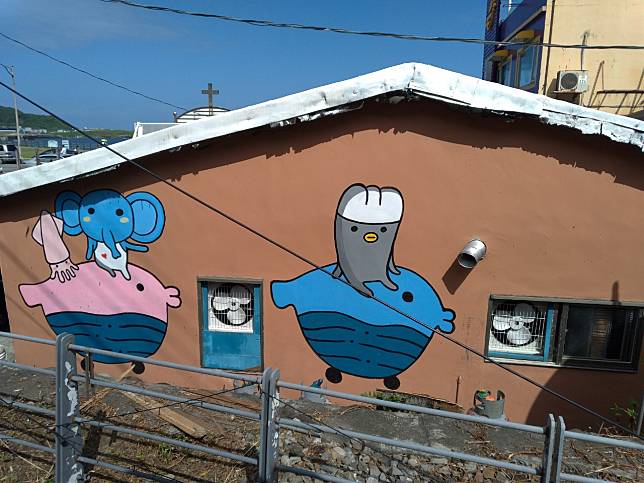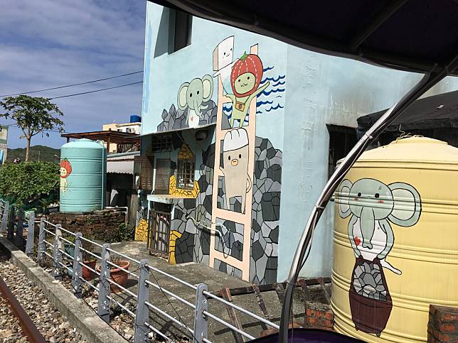 當鐵道自行車騎過海岸線之後,就會經過一段彩繪民宅區,兩旁的建築物、民宅牆上都繪有深澳鐵道自行車的吉祥物「豆腐君、象鼻君、山野君」,經過的時候大家不妨轉頭找找哪邊有可愛的彩繪喔!