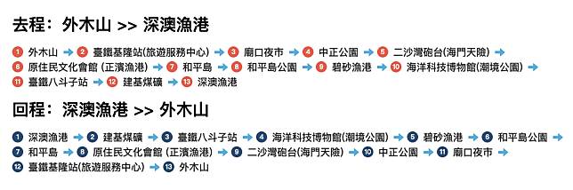 黃金博物館 → 時雨中學 → 台2線濱海公路左轉(往基隆) → 深澳 → 北寧路 → 海科館→八斗子商圈。