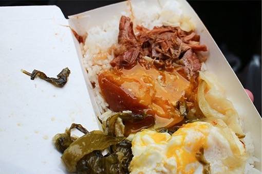 在地人推薦老字號爌肉飯,要瘦要肥隨你挑,加上半熟蛋,完美搭配。