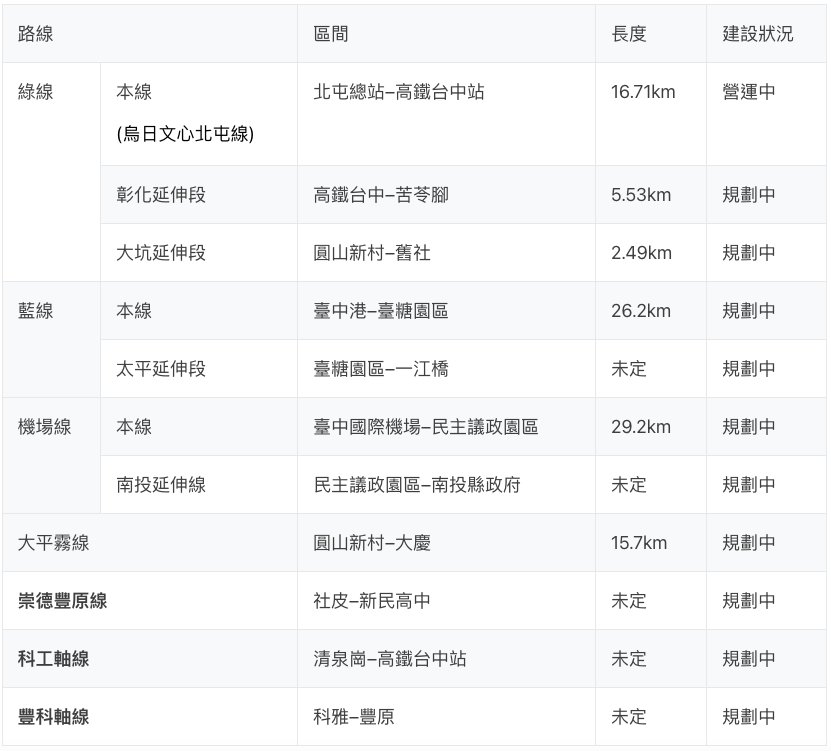 於1990年代就開始規劃的台中捷運,雖然一度因為資金及使用需求等各種因素延宕建設計畫,在2009年秋天正式開始動工興建。除了已通車的綠線(北屯總站-高鐵台中站)之外,台中捷運還規劃有西至台中港、東至台糖園區與綠線交叉成十字路線網的藍線、台中國際機場延伸進台中市區的機場線、規劃連結綠線成環狀線的紫線-大平霧線、還有綠線藍線的延伸路段等等。