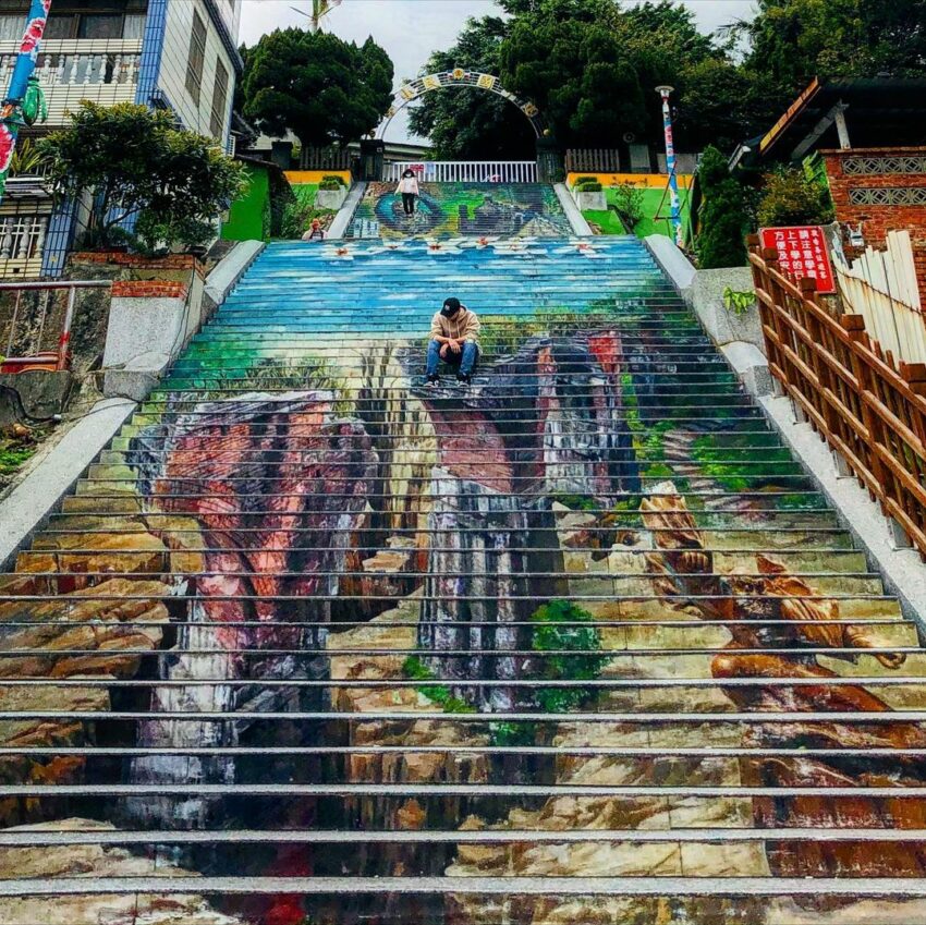往前走過木雕博物館後,還可以順道到【廣盛老街】與建中國小的3D彩繪樓梯來個合影,曾彩繪過電影《少年PI的奇幻漂流記》場景的作者將三義鄉各處景點巧妙的呈現在這片登上國小校門口的樓梯上,就像是室外的攝影棚非常殺底片。