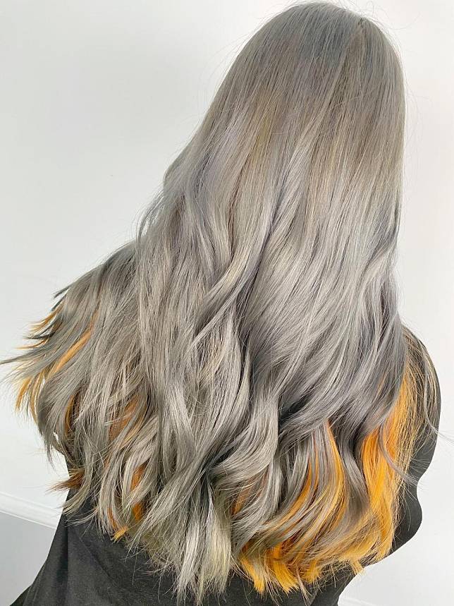 雙層染選了明亮的芒果冰沙黃mix 氣質淡雅的杏仁灰 ,撞色搭配讓人眼睛為之一亮,高調與優雅原來可以兼具