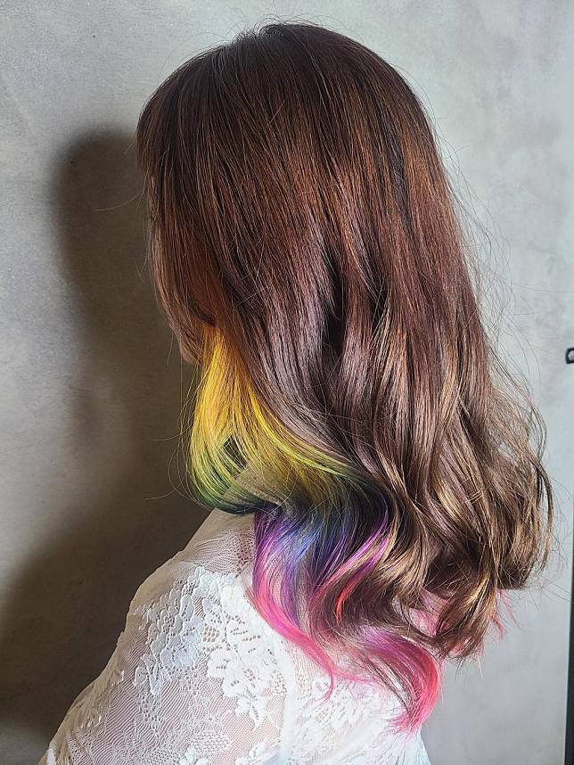 刨冰選配料總是想貪心全加,連髮色也一樣要全部都來一點嗎?使用漸層 + 隱藏染手法,就可以一次染很多種色又不失時尚感