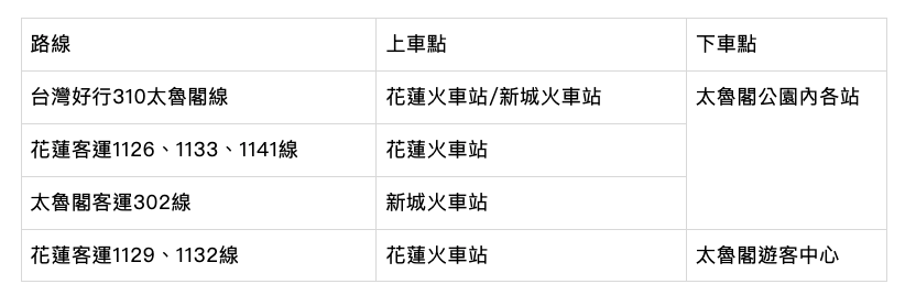 於花蓮站或新城站下車,轉搭公車或客運到達太魯閣