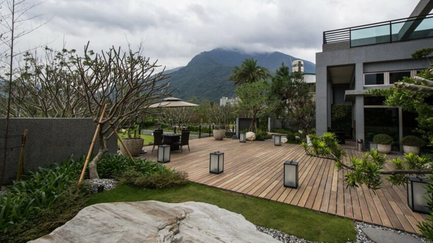 花蓮立閣人文旅店的地理位置相當方便,距離新城火車站步行約10分鐘,附近超商、攤商、店家眾多,半夜不怕餓肚子啦。這裡的房間數不多,但每間都是面向立霧溪,能遠眺清水斷崖的景觀房。立閣人文旅店後方的景觀花園,引入立霧溪水並種植整排的落羽松,不論白天晚上都很漂亮。