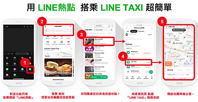 使用步驟:在LINE熱點上查找想去的餐廳或旅遊景點,找到離最近的美食旅遊地點!在商家資訊頁點選【LINE TAXI】後,開啟地圖準備出發!