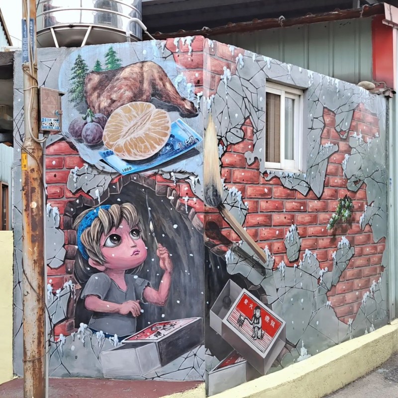 位於石岡區公所附近的「九房3D彩繪村」,由3D彩繪曾進成老師創造一幅幅童話故事生動彩繪,包括傑克與魔豆、青蛙王子、拇指姑娘、巫婆的糖果屋、賣火柴的小女孩、三隻小豬、醜小鴨、七隻小羊等主題以及4D彩繪綠野仙蹤,透過不同的角度取景可與畫中人物進行互動,讓人彷彿進入童話故事般夢幻。