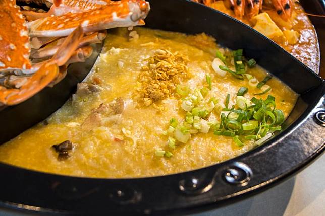 「霸氣螃蟹海鮮粥」特選香氣十足的台梗九號,不僅米粒透明飽滿,而且黏性佳、口感又好,粒粒分明卻又入口即化,除了一整隻螃蟹外,粥裡還有每日台南直送的新鮮魚皮、阿根廷的槍烏賊、個頭飽滿的蛤蜊、鮮味十足的珠貝與Q彈的魚丸,一格粥把山珍海味全包含在裡面。