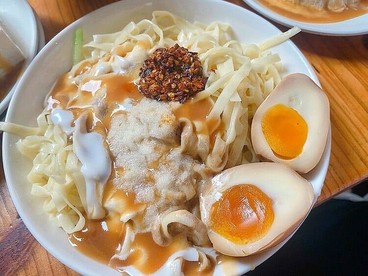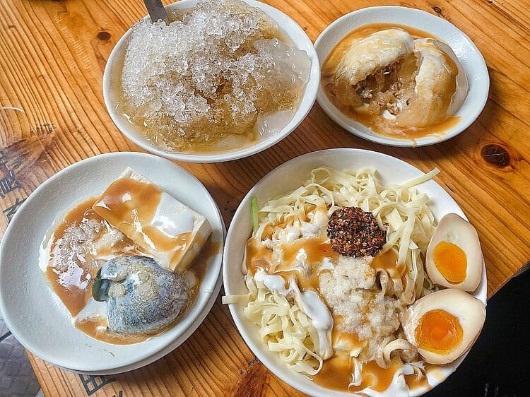 嘉義的涼麵跟你想的不一樣!寬版的粗意麵淋上芝麻醬及美乃滋白醬,搭配蒜泥、刨絲的小黃瓜,容易膩口的美乃滋原本讓人害怕,結果吃起來意外清爽,芝麻及蒜味綜合了美乃滋的甜,味道層次很特別。涼圓也是另一個招牌必點,彈牙的外皮又Q又有嚼勁,內餡是竹筍和肉末,同樣淋上美乃滋白醬、麻醬、蒜泥等,就像在吃清淡的冷肉圓。