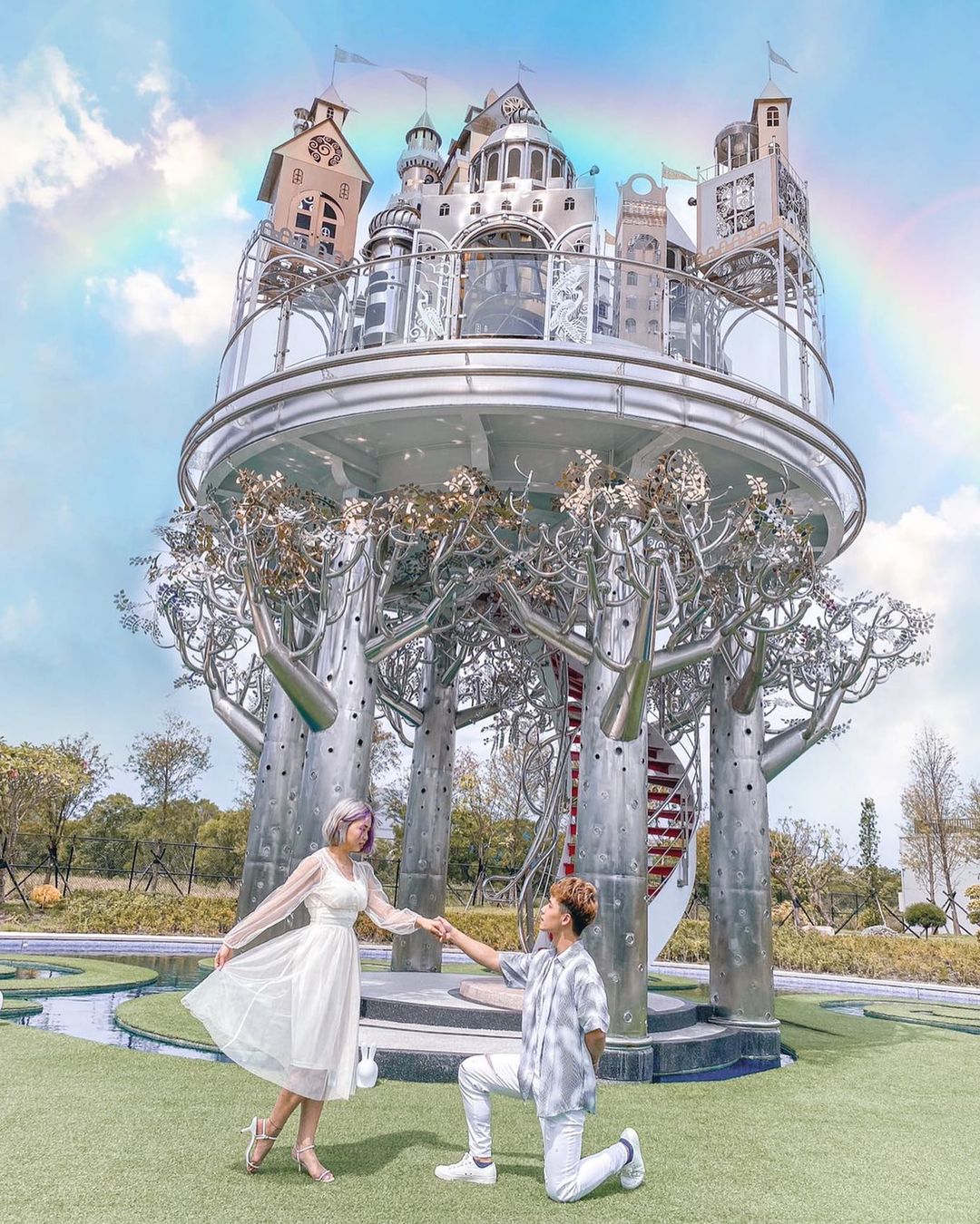 最多人到此拍攝的重點就是庭園中那座空中城堡,晶透的鏡池上是生命樹形狀的綠草地,象徵生生不息的意象,具有未來科技感的空中城堡就矗立在上方,彷彿是宮崎駿電影《天空之城》中的場景,唯美的景色超級好拍!