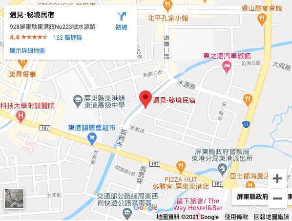 位於屏東東港水源路上,距離東港夜市只要2分鐘腳程。這棟外觀相當新穎時尚的民宿,也是生活機能派旅人最愛的選擇之一!鄰近大鵬灣國家風景區、東港夜市,生活機能相當方便,如果想順便前往小琉球旅遊,這裡甚至還有代售船票服務,真是太便利了啊!