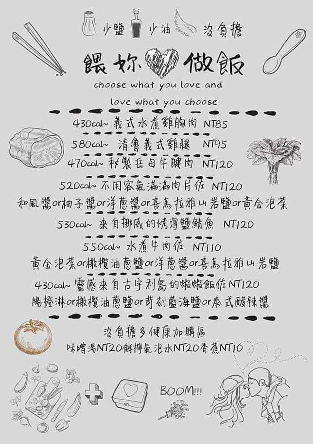 餵妳做飯主打少油少鹽烹調非完全水煮,肉品吃起來富有湯汁、也經過一些調味、醃製處理,不用擔心過於無味,且多以香料代替油炒,再加入一點薄鹽調味,菜色清爽簡單,可以吃出食物最原始的味道,另外如果便當類吃不飽,還可以再單點菜類唷。