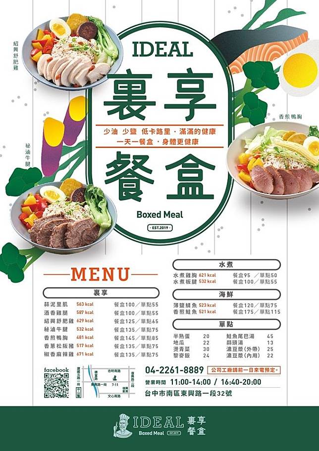 位在福科路上的餵妳做飯,源自老闆幫老婆解決外食煩惱的愛夫便當,主菜包含豬、雞、牛、魚、蝦等,另外也有香蕉、氣泡水可以加購。配菜則會不定時更換,一個便當裡面除了主菜以外還會有兩樣配菜、水煮蛋半顆、清蒸地瓜,還有很特別一點是,店家還加入每日必需的堅果,飯類選用較多的纖維及營養價值的紫米,Q彈又好吃。