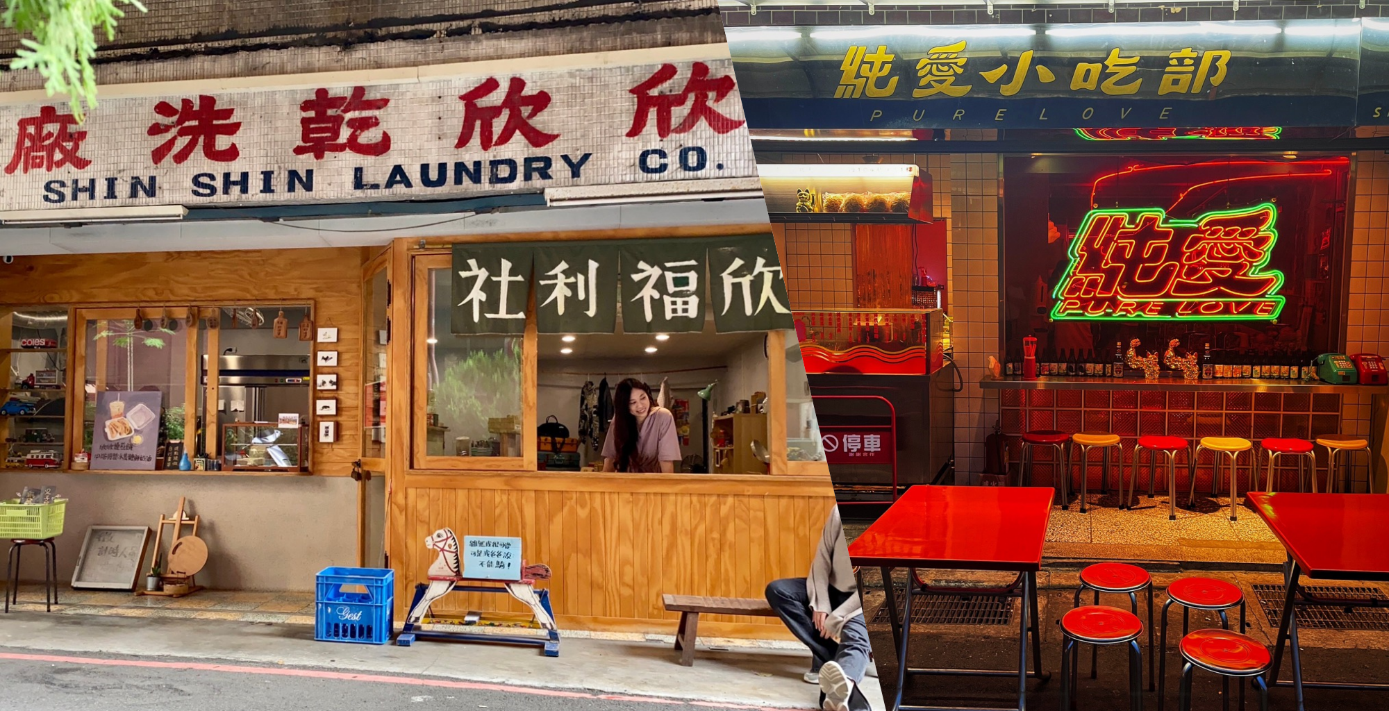 重新營業的「香蕉新樂園」店內以復古台灣街道為靈感設計,進入店裡就像走進時光隧道。柑仔店、電影院、照相館、理髮廳,還有小學書桌椅⋯⋯等,各種懷舊元素充斥其中,在這裡你可以盡情拍照打卡!餐點供應經典台式菜餚,週末晚間時段還有現場演唱,沉浸其中,時光彷彿逆流回民歌餐廳盛行的年代。