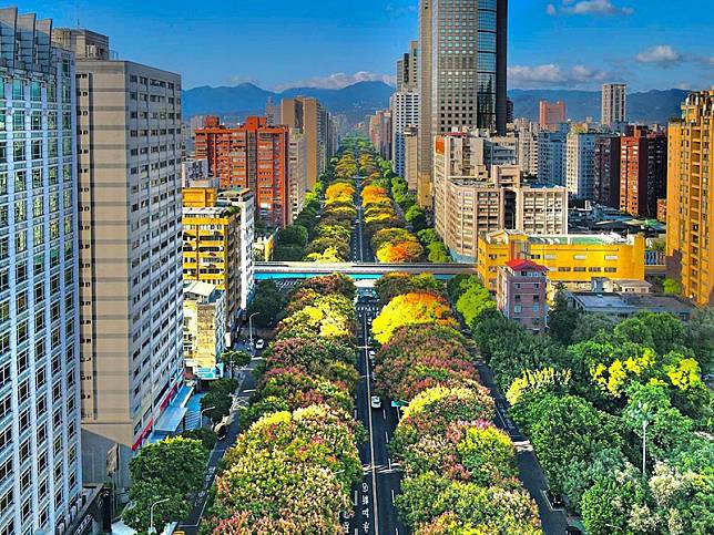 每到了秋季,台北大安區敦化南路上的一整排欒樹便會換上新妝,排排站的台灣欒樹以空拍的視角拍攝更是壯觀,綠、黃、橘紅色調同框成了難得的三色花海隧道,快點趁著秋意正濃時來一賞這絕景吧!