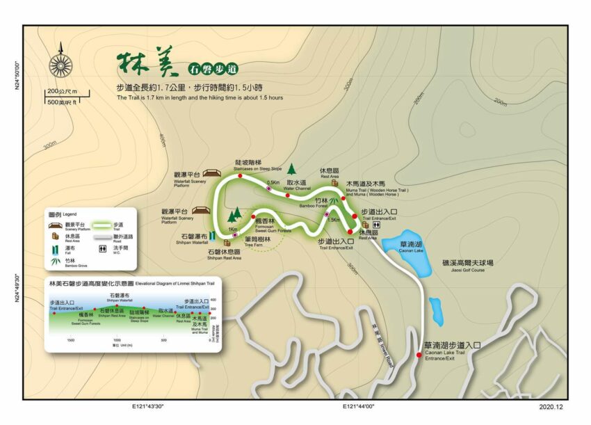 林美石磐步道全長約1.7公里,是一條O行環狀步道,只要繞著走一圈就能回到原點,不需要折返。到林美石磐步道前得先穿越草湳湖臨湖步道,沿途有許多景觀、休息區可供遊客們稍作休憩,不過要注意的是步道內沒有化妝室,只有林美石磐步道入口處有,記得先上個廁所再準備出發!