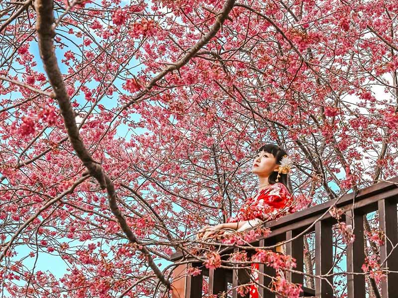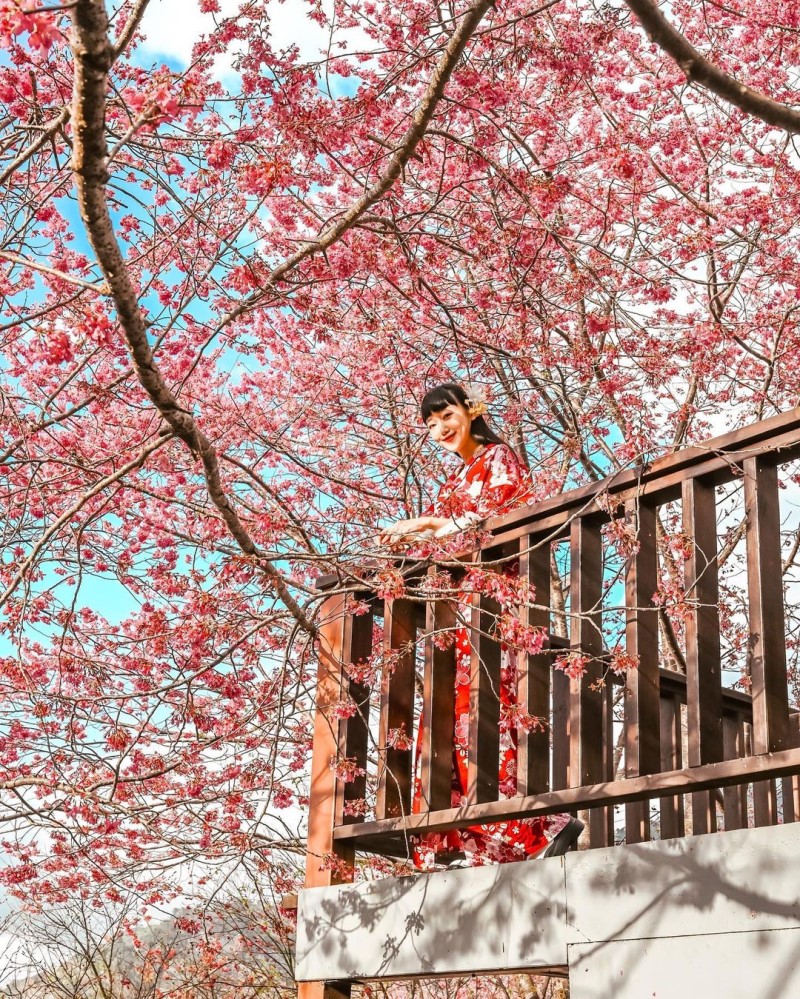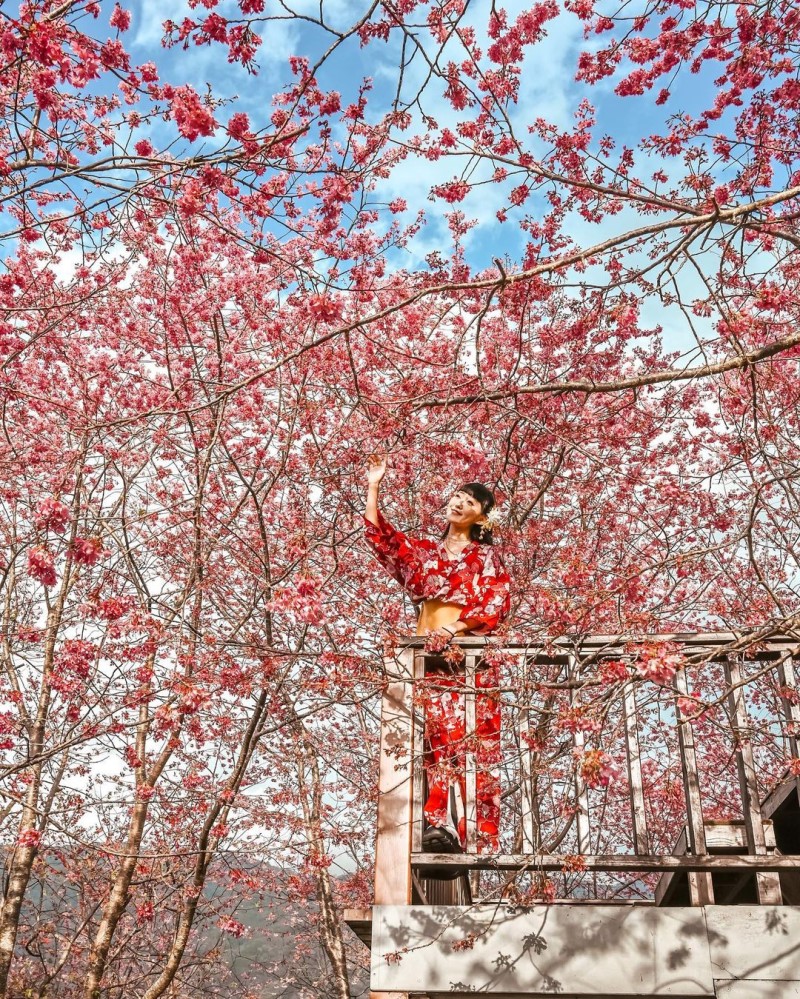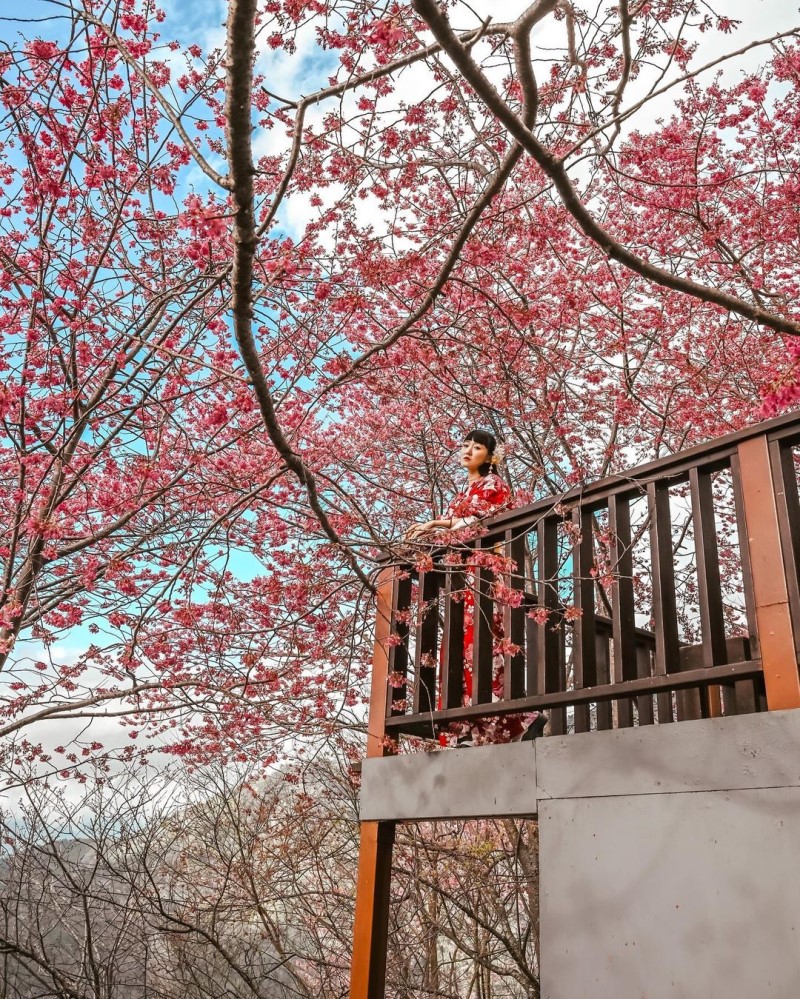 「財伯觀光果園」位於新竹尖石鄉山區,距離賞櫻熱點司馬庫斯大約一小時的路程,不過這裡免管制,也不需事先申請通行證,尤其是今年2022年櫻花花況良好,氣候影響提早進入了盛開期,尤其是此處有一座小平台,站在這裡就可以享受到被粉嫩櫻花包圍的浪漫氛圍,站在平台下由下往上拍則可以欣賞到櫻花盛開到塞滿了整個相機的畫面,搭配藍天白雲,是最佳的賞櫻景點。