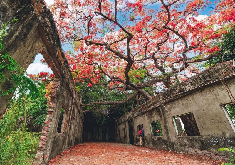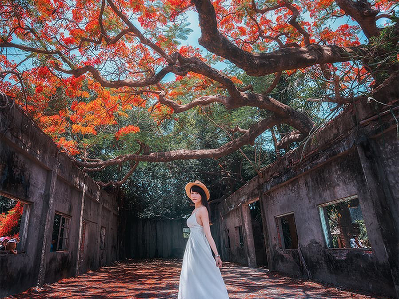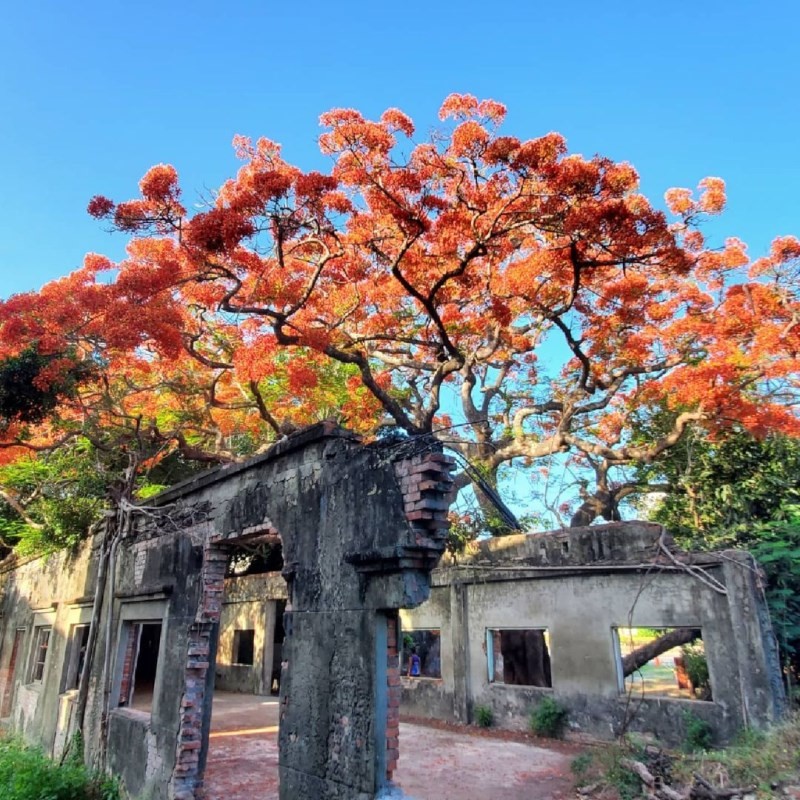 「柑仔蜜會社」又稱「番茄會社」,是日治時期的番茄工廠,也是二戰時期的鳳梨罐頭工廠,雖說隨著時代變遷,如今的工廠原址已剩斷垣殘壁,但一旁百年鳳凰花依然年年綻放,為這處廢墟帶來無限生機。