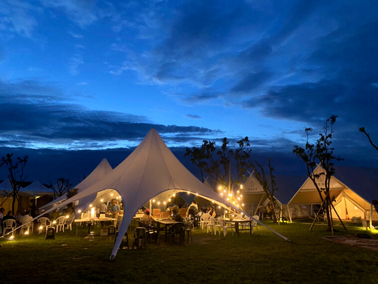 占地10公頃,有進口野奢蓮花帳,也有選用比利時品牌Canvascamp打造的經典鐘型的「神殿帳」,內含兩個25公分彈簧床墊、移動式冷暖空調、電扇與夜燈。另外直徑5米的「蒙古包」,則擁有寬敞挑高結構、開窗設計,帳內也設有冷暖空調,讓人待在裡頭也能眺望大海。