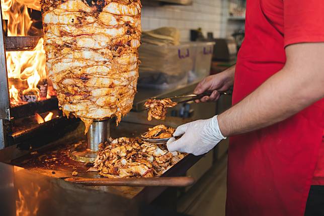 源自於中東地區的沙威瑪(Shawarma),是當地很常見的街邊小吃,將羊肉、雞肉、火雞肉、牛肉層層堆疊串成超巨大的肉塔的置於烤肉叉上燒烤,同時不斷地將表面已烤熟的肉削下。