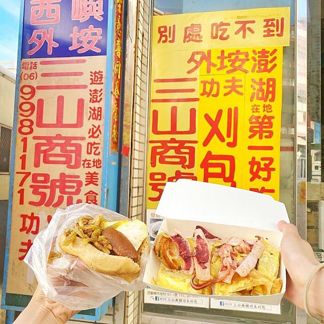 熟悉的刈包外表是包裹著白色的外衣,但在澎湖卻選用口感Q彈的黑糖饅頭,加入滷的入口即化的控肉,半肥半瘦的比例在嘴裡和酸菜的香氣成了絕配,再咬下一口半熟蛋,溢出的蛋黃更加順口,簡直是人間美味,早餐就是這麼大份滿足。還吃得下可以加點小管蔥餅,小管煎的酥脆可口,是澎湖當地才有的美食組合呢!