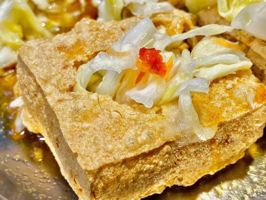 炸得金黃的臭豆腐外皮酥脆,內層卻還是軟嫩多汁。剛炸出爐的臭豆腐聞著臭,吃起來卻是香氣十足,甚至還能咀嚼出些許的黃豆香,淋上特製的醬汁,將爽脆的泡菜塞進豆腐裡,最後再沾上一點辣椒醬,就是最完美的老饕吃法啦!
