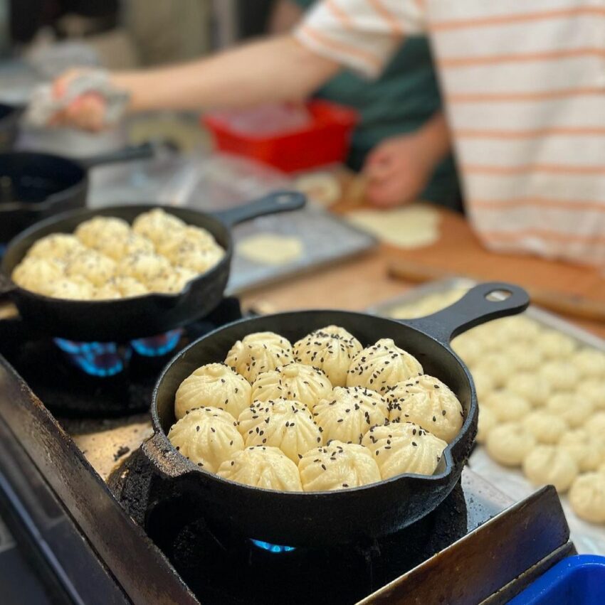 來到身煎百戰的攤位前,能看到老闆正忙碌的在現場包包子,一顆顆白胖胖的生煎包被擺進黑色鑄鐵鍋裡,在大火加持下,漸漸散發出誘人的香氣,剛出爐的生煎包,底下被煎得金黃香脆,上方仍是又軟又Q的白嫩麵皮,色香味俱全。