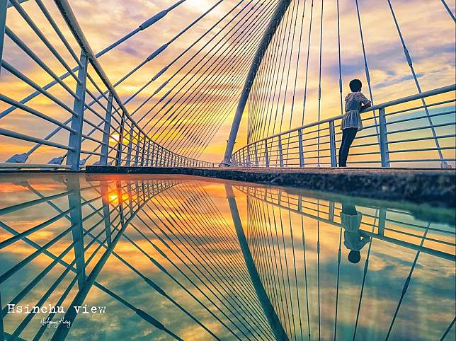 圓弧狀的橋墩連接細直鋼索,「豎琴橋」因為造型像極了豎琴而得名,這裡的攝影照片曾登上日本Nikon年度月曆封面,讓豎琴橋一炮而紅,成為攝影愛好者練拍的熱門場地。尤其在日落時,豎琴橋邊的透明玻璃反射天空景色,夕暮餘暉染上玻璃,上下對稱就像是天空之鏡,不管是散步賞景或是拍攝美照都非常適合!