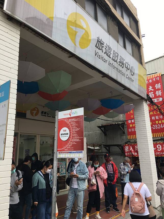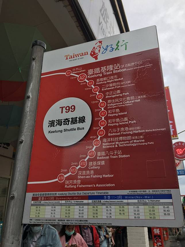 旅遊服務中心的位置不太好找,從台鐵基隆南站出口出來後,左側會看到國光客運的乘車處和服務中心,穿過國光客運後,會看到不遠處有一個寫著「i」的黃色招牌,那裡就是濱海奇基線的搭乘處。