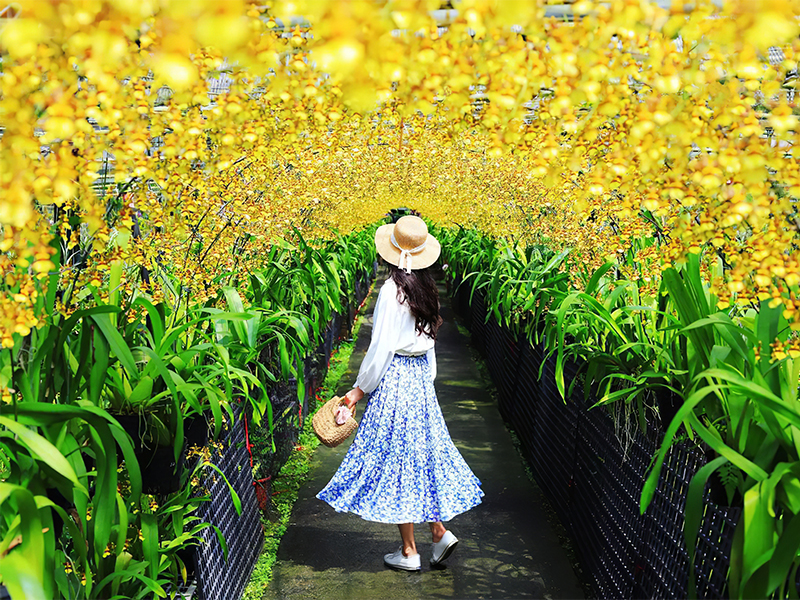 宜蘭近年最受歡迎的賞花景點─金雙甡花卉農場,6月初夏正是文心蘭綻放的時刻,園內栽種將近500盆文心蘭,將其打造成「黃金花海隧道」,每到文心蘭盛開時,總吸引著大批遊客是前來一睹風采,金燦燦花朵在陽光照耀下閃閃發光,形成一片壯觀美景,令人沉醉其中。