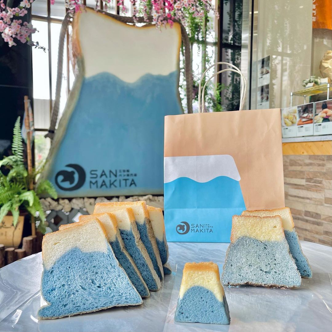 採用日式工法製作,整體使用日本進口麵粉、北海道函館鮮奶製成,三牧田的外型有別於一般生吐司,是做成『天然富士山山體』,吐司藍色的部分是使用梔子花染色,相當可愛的造型,順便還可以一解無法出國的癮!