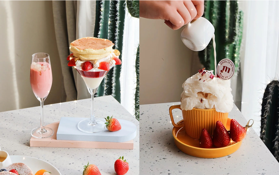 浮誇系甜點咖啡廳在ig上快速爆紅,酸酸甜甜的草莓宛如初戀的滋味,搭配鬆軟鬆餅、香濃煉乳與奶油泡,小巧的紅色水果便化身為療癒的熱門甜點!「Meat Up 覓晌」擁有兩間店面,分別為台北西門店與桃園藝文店,其中西門店的奶昔網美牆更是女孩們必拍熱點,甜點則以經典款「101草莓塔」、升級版「豪華草莓塔」讓草莓控最為瘋狂,堆疊超高的大湖草莓搭配不膩口的鮮奶油,草莓醬與蛋糕融合,些微脆口的小圓餅與入口即化的口感,讓人眷戀不已。