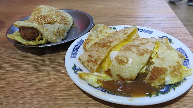 如同店名一般,店家的蛋餅皮是四方形,加上蛋液之後的蛋餅意外的有份量,且蛋餅皮煎過之後有著酥脆的外皮又有些嚼勁;因店內老闆只有一個人,所以醬油膏跟辣醬放在旁邊供客人依喜好取用,但是剛煎好的蛋餅不論有沒有刷醬都很好吃的喔!
