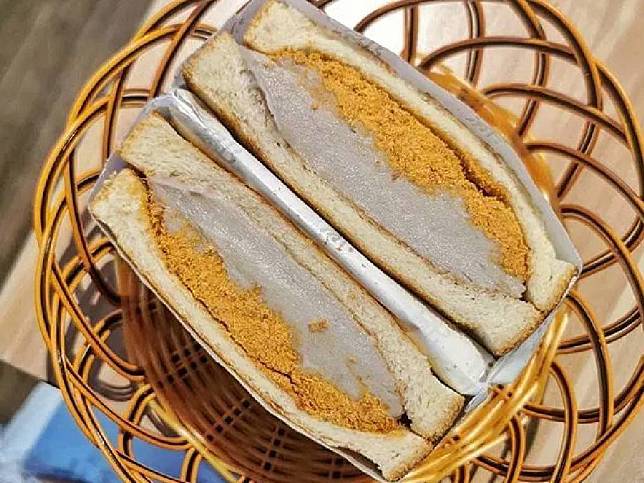 店家招牌是芋泥系列吐司,吐司內夾著幾乎溢出的芋泥,淡紫色與米白色層疊起來的三明治切面,既上相又美味,份量也很足;其中,芋泥肉鬆吐司(65元)甜鹹衝突又互相搭配的滋味,是不能錯過的台灣味美食喔。