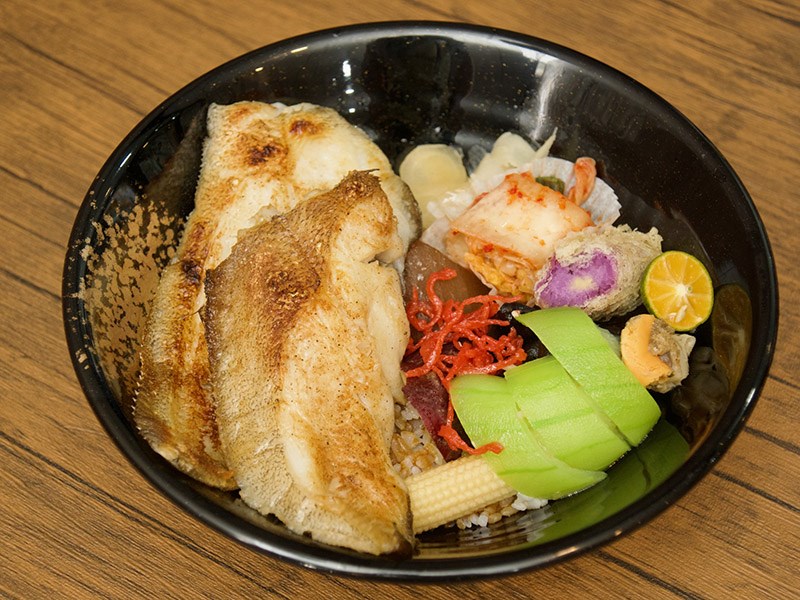 【星鶴丁】主打CP值超高的大碗丼飯,不僅白飯、主菜都給的十分豪邁,連配菜也絲毫不馬虎,甚至還有蝦子、帆立貝等海鮮的身影,而大方放上兩大塊比目魚的「椒鹽比目魚丼飯」更是饕客來店必點。